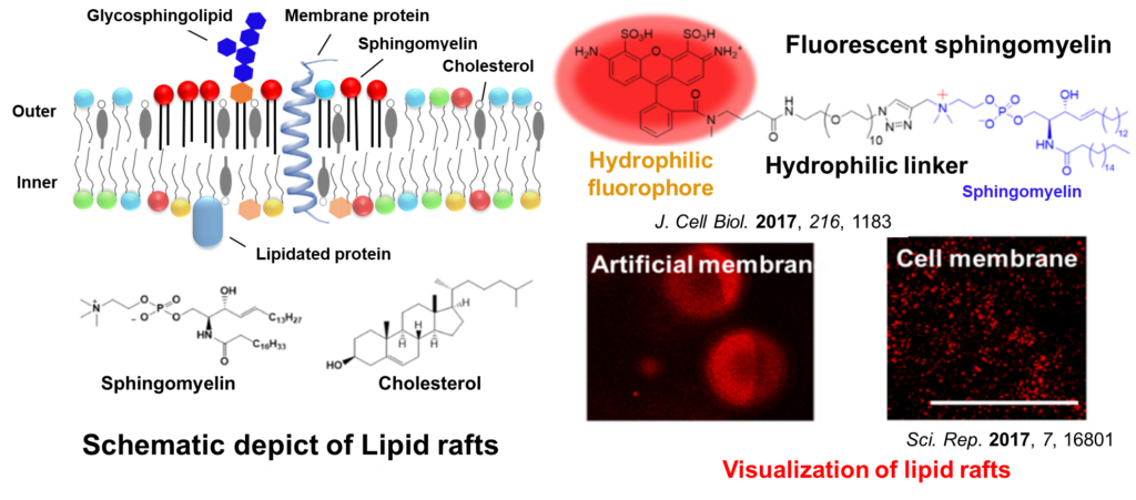 Biomembranes are not merely passive barriers separating internal organs from the external environment; they also play crucial physiological roles, such as signal transduction through membrane protein receptors. The study of biological membranes is becoming increasingly important, as many drugs target membrane proteins, and these membranes are implicated in the pathogenesis of various diseases, including Alzheimer’s disease and viral infections. However, biomembranes remain one of the most challenging subjects in life sciences due to their complex structure, which relies on weak interactions among lipids, proteins, and sugar chains. Our research takes a unique approach to studying biomembranes by integrating organic chemistry (chemical biology) and analytical chemistry, as illustrated in the figure below. The following is a brief overview of our work.