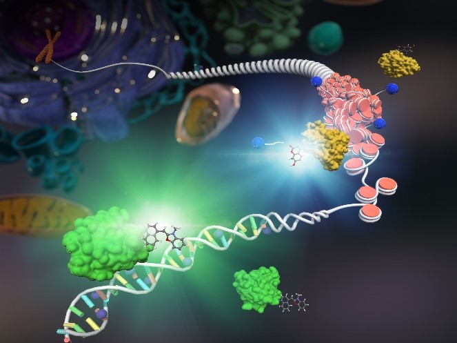 エピジェネティクスは、DNAの塩基配列によらずに遺伝子発現を制御する仕組みであり、近年大きな注目を集めています。特に、DNAメチル化は、エピジェネティクス機構における代表的な化学修飾の一つであり、その異常は、癌や免疫疾患などの様々な原因となることが知られています。このため、生命科学のみならず医学・創薬の分野で、その機構解明が重要視されています。これまでに、メチル化DNAを解析する方法として、細胞をすりつぶす生化学的手法が多数報告されています。一方、生細胞の状態で解析する方法の開発は、DNAメチル化のダイナミクスを明らかにするうえで極めて有用でありますが、その方法は蛍光タンパク質を用いた方法に限られています。我々は、タンパク質ラベル化技術を応用することで、合成色素とタンパク質からなるハイブリッドプローブを細胞内で構築しました。このハイブリッドプローブは、メチル化DNAに特異的に結合し、その結合に伴い蛍光強度を上昇させる機能を持っています。このハイブリッドプローブによりメチル化DNAの生細胞における動態を可視化することに成功しました。DNAのメチル化以外にも、多様な核酸の化学修飾が知られているものの、その細胞内動態や機能には多くの解明すべき課題が存在します。このため、現在では、ハイブリッドプローブ技術を発展させて、それらの核酸の化学修飾の可視化とその機能の解明を可能とする技術の開発に取組んでいます。