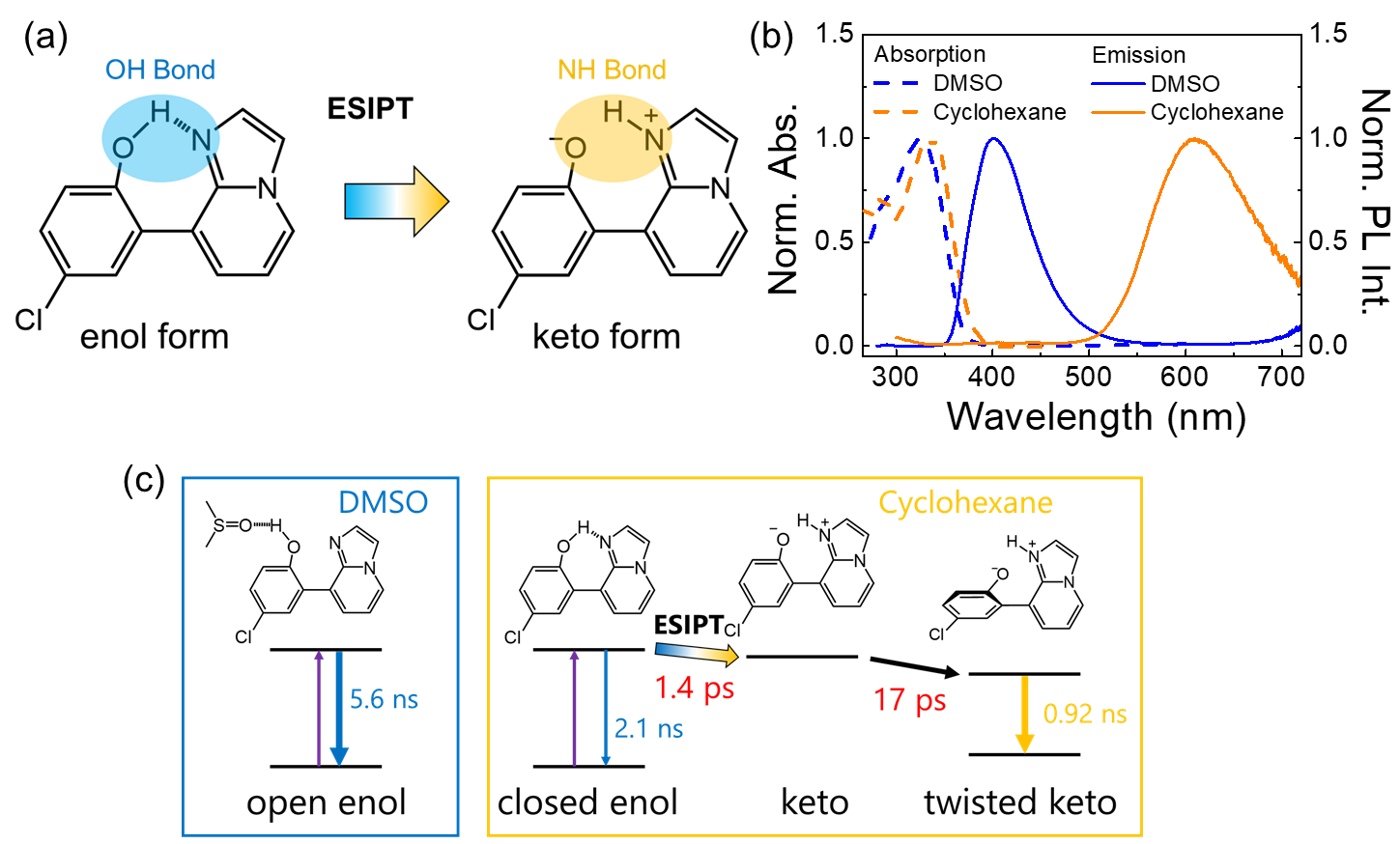 図2. (a) 5ClPh-IPの構造とそのESIPT機構.(b) 5ClPh-IPのDMSO及びシクロヘキサン溶液の定常発光スペクトル.(c)5ClPh-IPのESIPTダイナミクス.