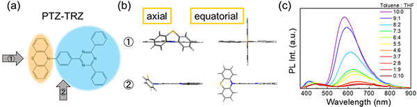 図1. (a) PTZ-TRZの構造.(b) PTZ-TRZの二つの励起状態構造.(c)トルエンとTHF混合溶液の発光スペクトル.