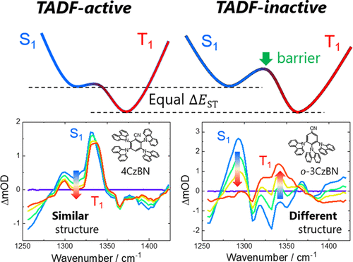 Organic compounds made of light elements such as carbon, oxygen, and sulfur can be easily designed and exhibit a variety of optical functions, for example, thermally activated delayed fluorescence and room-temperature phosphorescence. Their mechanisms are, however, very complicated and are not easily revealed. Using our time-resolved infrared vibrational spectroscopy and other complementary measurement systems, we are exploring their photo-excited processes in solution and in solids in terms of structural dynamics.
